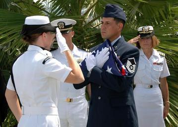 Keywords: US Navy 080819-N-7974M-008 U.S. Air Force Master Sgt. Jeff Wheeler receives an American flag from a Navy honor guard detail during a scattering of ashes ceremony honoring his grandfather and Pearl Harbor survivor, Major Wheeler.jpg en PEARL HARBOR Aug 19 2008 U S Air Force Master Sgt Jeff Wheeler receives an American flag from a Navy honor guard detail during a scattering of ashes ceremony honoring his grandfather and Pearl Harbor survivor Major Wheeler Wheeler was a U S Navy chief petty officer assigned to the minesweeper USS Widgeon AM 22 during the attack on Pearl Harbor The ceremony included a religious ceremony a three-volley rifle salute and a bugler sounding Taps Also in attendance was Wheeler's local church choir who sang the Navy Hymn U S Navy photo by Blair Martin/Released 2008-08-19 080819-N-7974M-008 Navy http //www navy mil/view_image asp id 62802 U S Navy photo by Blair Martin PD-USGov-Military-Navy USS Utah Memorial Salutes |