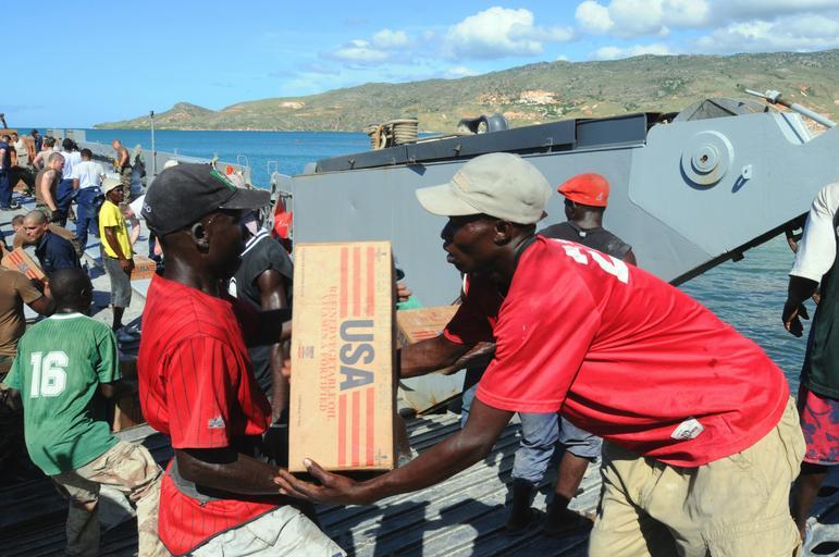 | Keywords: US Navy 080922-N-7955L-118 Haitian civilians help move boxes of cooking oil delivered by U.S. service members embarked aboard the amphibious assault ship USS Kearsarge (LHD 3) during a humanitarian assistance mission.jpg  en GONAIVES Haiti September 22 2008 Haitian civilians help move boxes of cooking oil delivered by U S service members embarked aboard the amphibious assault ship USS Kearsarge LHD 3 during a humanitarian assistance mission Kearsarge has been diverted from the scheduled Continuing Promise 2008 humanitarian assistance deployment in the western Caribbean to conduct hurricane relief operations in Haiti U S Navy photo by Mass Communication Specialist 3rd Class Christopher Lange Released 2008-09-22 080922-N-7955L-118 Navy http //www navy mil/view_image asp id 64363 U S Navy photo by Mass Communication Specialist 3rd Class Christopher Lange PD-USGov-Military-Navy Port of Gonaïves Humanitarian aid in Gonaïves Transport in Gonaïves Ships in Gonaïves People of Gonaïves Military people of the United States in Gonaïves Aboard USS Kearsarge LHD-3 2008 in Gonaïves 0922 September 2008 in Haiti 22 |