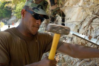 | Keywords: US Navy 080924-N-3595W-169 Engineering Aide 2nd Class Hugo Lerma drives rebar into the ground before reconstructing a water pipeline.jpg en BAINET Haiti Sept 25 2008 Engineering Aide 2nd Class Hugo Lerma from Construction Battalion Mobile Unit CBMU 202 deployed with the amphibious assault ship USS Kearsarge LHD 3 drives rebar into the ground before reconstructing a water pipeline that was destroyed by recent hurricanes Service members from the Navy Army Air Force Marines and Coast Guard along with medical personnel from the U S Public Health Service Canadian Army Air Force and Navy Brazil Project HOPE and International Aid embarked aboard Kearsarge are working together to conduct hurricane relief operations in Haiti U S Navy photo by Mass Communication Specialist 2nd Class Gina Wollman/Released 2008-09-25 080924-N-3595W-169 Navy http //www navy mil/view_image asp id 64577 U S Navy photo by Mass Communication Specialist 2nd Class Gina Wollman PD-USGov-Military-Navy Images from US Navy location BAINET Haiti Engineering Aide United States Navy People using hammers Rebar |