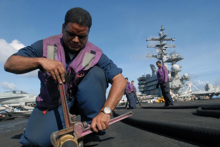 | Keywords: US Navy 081107-N-7730P-021 Aviation Boatswain's Mate (Fuels) 1st Class Antonio Osorio tightens a hydrostatic test cap onto the end of a flight deck of the Nimitz-class aircraft carrier USS Ronald Reagan (CVN 76).jpg en PACIFIC OCEAN Nov 7 2008 Aviation Boatswain's Mate Fuels 1st Class Antonio Osorio tightens a hydrostatic test cap onto the end of a flight deck of the Nimitz-class aircraft carrier USS Ronald Reagan CVN 76 Since such a high water pressure is used to test hoses the caps must be precisely aligned and tightly seated The Ronald Reagan Carrier Strike Group is on a routine deployment in the U S 7th Fleet area of responsibility operating in the Western Pacific and Indian oceans U S Navy photo by Mass Communication Specialist 3rd Class Gary Prill/Released 2008-11-07 081107-N-7730P-021 Navy http //www navy mil/view_image asp id 66268 U S Navy photo by Mass Communication Specialist 3rd Class Gary Prill PD-USGov-Military-Navy Aviation Boatswain's Mates Fuels Flight deck maintenance aboard USS Ronald Reagan CVN-76 |