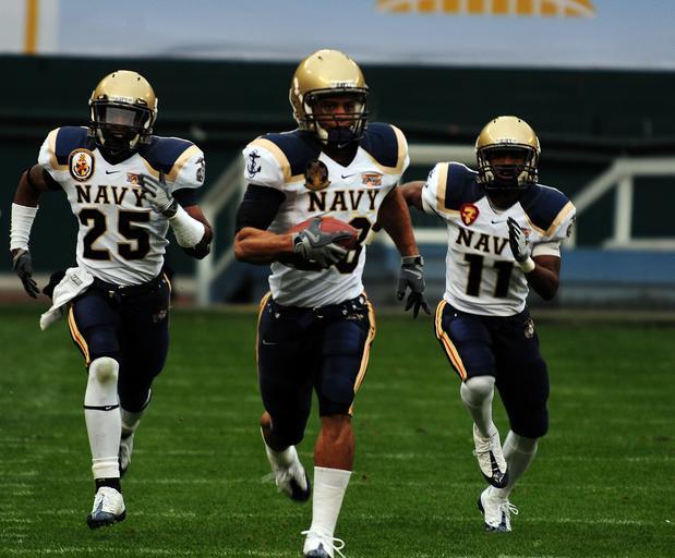 | Keywords: US Navy 081220-N-0923G-001 U.S Naval Academy wide receiver Greg Jones (^28) leads fellow Midshipmen safety Emmett Merchant, left, (^25) and cornerback Ketrick Buffin (^11) during the inaugural EagleBank bowl college football ga.jpg en WASHINGTON Dec 20 2008 U S Naval Academy wide receiver Greg Jones 28 leads fellow Midshipmen safety Emmett Merchant left 25 and cornerback Ketrick Buffin 11 during the inaugural EagleBank bowl college football game Saturday Dec 20 2008 against Wake Forest University at R F K Stadium in Washington U S Navy photo by Mass Communication Specialist 2nd Class Dustin Gates/Released 2008-12-20 081220-N-0923G-001 Navy http //www navy mil/view_image asp id 67532 U S Navy photo by Mass Communication Specialist 2nd Class Dustin Gates PD-USGov-Military-Navy Military in Washington D C |