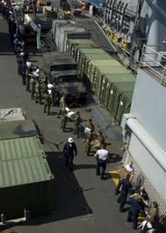 Keywords: US Navy 090216-N-1251W-130 Sailors and Marines aboard the amphibious dock landing ship USS Harpers Ferry (LSD 49) form a working party to move stores from the ship's flight deck during a vertical replenishment.jpg en GULF OF THAILAND Feb 16 2009 Sailors and Marines aboard the amphibious dock landing ship USS Harpers Ferry LSD 49 form a working party to move stores from the ship's flight deck during a vertical replenishment with the Military Sealift Command dry cargo/ammunition ship USNS Richard E Byrd T-AKE 4 Harpers Ferry is taking part in Exercise Cobra Gold an annual Thailand and U S co-sponsored joint coalition multinational military exercise designed to train a Thai U S and Singaporean Coalition Task Force The exercise will also include humanitarian civic action projects with participating nations from Indonesia Japan Singapore Thailand and the U S U S Navy photo by Mass Communication Specialist 2nd Class Matthew R White/Released 2009-02-16 090216-N-1251W-130 Navy http //www navy mil/view_image asp id 69266 U S Navy photo by Mass Communication Specialist 2nd Class Matthew R White PD-USGov-Military-Navy Aboard USS Harpers Ferry LSD-49 |