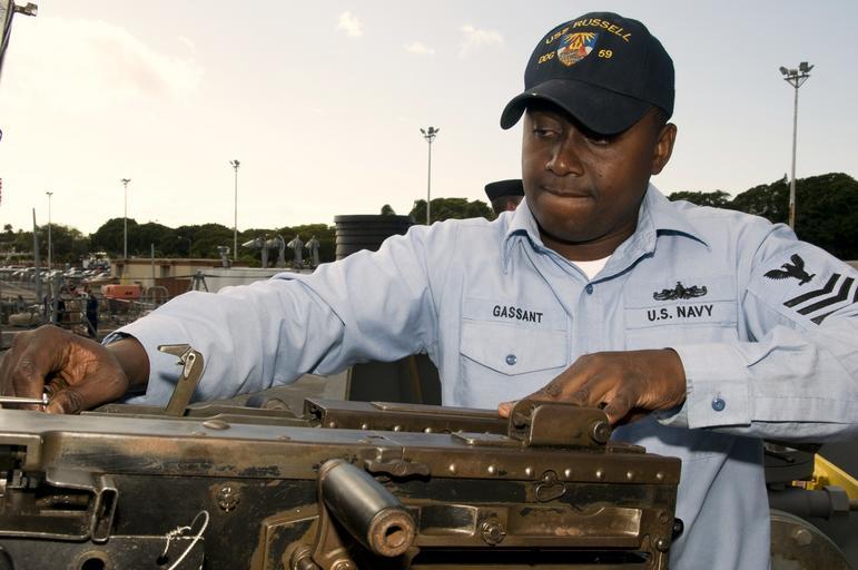 Keywords: uss russell ussrussell ddg 59 ddg59 naval station pearl harbor navalstationpearlharbor pearl harbor pearlharbor hawaii united states unitedstates outdoor 090226-N-6674H-003: PEARL HARBOR, Hawaii (Feb. 26, 2009) Gunner’s Mate 1st Class Max Gassant, assigned to the guided-missile destroyer USS Russell (DDG 59), works on a .50 caliber machine gun on the ship’s weather deck as part of an annual weapons qualification. (U.S. Navy photo by Mass Communication Specialist 2nd Class Paul D. Honnick/Released) 090226-N-6674H-003: PEARL HARBOR, Hawaii (Feb. 26, 2009) Gunner’s Mate 1st Class Max Gassant, assigned to the guided-missile destroyer USS Russell (DDG 59), works on a .50 caliber machine gun on the ship’s weather deck as part of an annual weapons qualification. (U.S. Navy photo by Mass Communication Specialist 2nd Class Paul D. Honnick/Released) 090226-N-6674H-003.