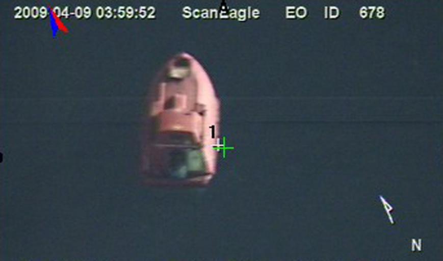 | Keywords: US Navy 090409-N-0000X-937 In a still frame from video taken by the Scan Eagle unmanned aerial vehicle, a 28-foot lifeboat from the U.S.-flagged container ship Maersk Alabama is seen Thursday, April 9, 2009 in the Indian Ocean.jpg en INDIAN OCEAN April 9 2009 In a still frame from video taken by the Scan Eagle unmanned aerial vehicle a 28-foot lifeboat from the U S -flagged container ship Maersk Alabama is seen Thursday April 9 2009 in the Indian Ocean U S Navy Photo 2009-04-09 090409-N-0000X-937 Navy http //www navy mil/view_image asp id 70465 U S Navy photo PD-USGov-Military-Navy Indian Ocean Maersk Alabama lifeboat Still images from videos Photos and video from unmanned aerial vehicles |