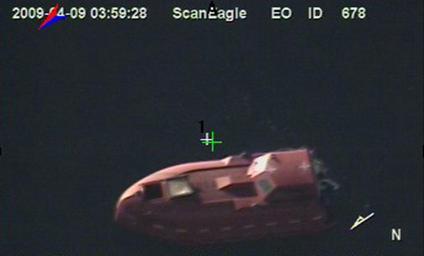| Keywords: US Navy 090409-N-0000X-913 In a still frame from video taken by the Scan Eagle unmanned aerial vehicle, a 28-foot lifeboat from the U.S.-flagged container ship Maersk Alabama is seen Thursday, April 9, 2009 in the Indian Ocean.jpg en INDIAN OCEAN April 9 2009 In a still frame from video taken by the Scan Eagle unmanned aerial vehicle a 28-foot lifeboat from the U S -flagged container ship Maersk Alabama is seen Thursday April 9 2009 in the Indian Ocean U S Navy Photo 2009-04-09 090409-N-0000X-913 Navy http //www navy mil/view_image asp id 70463 U S Navy photo PD-USGov-Military-Navy Indian Ocean Maersk Alabama lifeboat Still images from videos Photos and video from unmanned aerial vehicles |