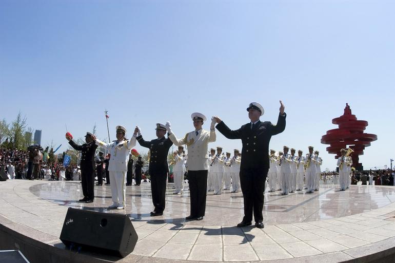 | Keywords: US Navy 090421-N-1251W-057 Senior Chief Musician Adam Vincent, right, joins hands with bandleaders from China, Russia, India, and South Korea.jpg en QINGDAO People's Republic of China April 21 2009 Senior Chief Musician Adam Vincent right joins hands with bandleaders from China Russia India and South Korea as the People's Liberation Army Navy band performs in the background Bands from nations participating in the 60th anniversary celebration of the founding of the People's Liberation Army Navy performed for Chinese citizens The forward-deployed guided-missile destroyer USS Fitzgerald DDG 62 is in Qingdao to participate in the International Fleet Review with units from 20 other nations U S Navy photo by Mass Communication Specialist 2nd Class Matthew R White/Released 2009-04-21 090421-N-1251W-057 Navy http //www navy mil/view_image asp id 70748 U S Navy photo by Mass Communication Specialist 2nd Class Matthew R White PD-USGov-Military-Navy Images from US Navy location Qingdao China Aboard USS Fitzgerald DDG-62 |