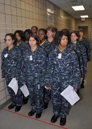 Keywords: US Navy 090430-N-8848T-972 Female recruits wait to have their newly issued navy working uniform examined by seamstresses at Recruit Training Command.jpg en GREAT LAKES Ill April 30 2009 Female recruits wait to have their newly issued navy working uniform examined by seamstresses at Recruit Training Command The uniform will replace the current working uniform and all present recruits will be issued the new working uniform over the next several weeks New recruits will be issued the uniform on their second day at boot camp U S Navy photo by Scott A Thornbloom/Released 2009-04-30 090430-N-8848T-972 Navy http //www navy mil/view_image asp id 71265 U S Navy photo PD-USGov-Military-Navy Recruit Training Command Great Lakes Illinois Women in the United States Navy |
