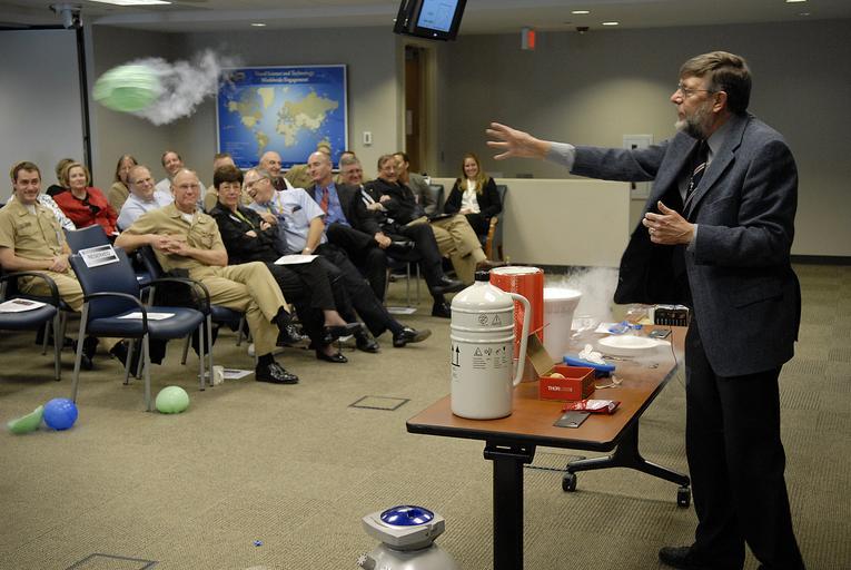 | Keywords: US Navy 090519-N-7676W-106 Dr. William D. Phillips, from the National Institute of Standards and Technology and recipient of the 1997 Nobel Prize in physics, demonstrates the effects of liquid nitrogen on balloons.jpg en ARLINGTON Va May 19 2009 Dr William D Phillips from the National Institute of Standards and Technology and recipient of the 1997 Nobel Prize in physics demonstrates the effects of liquid nitrogen on balloons during a lecture to Office of Naval Research employees and guests Phillips spoke about his work as a leading researcher in laser cooling and trapping of atoms during the Director of Innovation's distinguished lecture series These fundamental studies are used to develop applications for new kinds of physics measurements and processes such as high resolution spectroscopy atomic clocks atomic collisions atom optics bio-molecular interactions and atomic-scale and nano-scale fabrication U S Navy photo by John F Williams/Released 2009-05-19 090519-N-7676W-106 Navy http //www navy mil/view_image asp id 71810 U S Navy photo by John F Williams PD-USGov-Military-Navy Arlington County Virginia William Daniel Phillips |