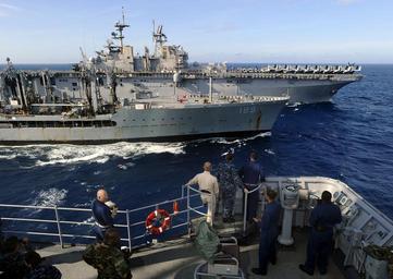 Keywords: US Navy 090523-N-5345W-307 Sailors aboard the amphibious dock landing ship USS Fort McHenry (LSD 43) watch from the conning station as the military sealift command fleet replenishment oiler USNS John Lenthall (T-AO 189), center.jpg en ATLANTIC OCEAN May 23 2009 Sailors aboard the amphibious dock landing ship USS Fort McHenry LSD 43 watch from the conning station as the military sealift command fleet replenishment oiler USNS John Lenthall T-AO 189 center conducts a replenishment at sea with the amphibious assault ship USS Bataan LHD 5 before Fort McHenry's approach to begin her own connected replenishment with John Lenthall Fort McHenry is on a scheduled deployment with the Bataan Amphibious Readiness Group ARG supporting maritime security operations in the U S 5th and 6th Fleet areas of responsibility U S Navy photo by Mass Communication Specialist 2nd Class Kristopher Wilson/Released 2009-05-23 090523-N-5345W-307 Navy http //www navy mil/view_image asp id 72132 U S Navy photo by Mass Communication Specialist 2nd Class Kristopher Wilson PD-USGov-Military-Navy Aboard USS Bataan LHD-5 |