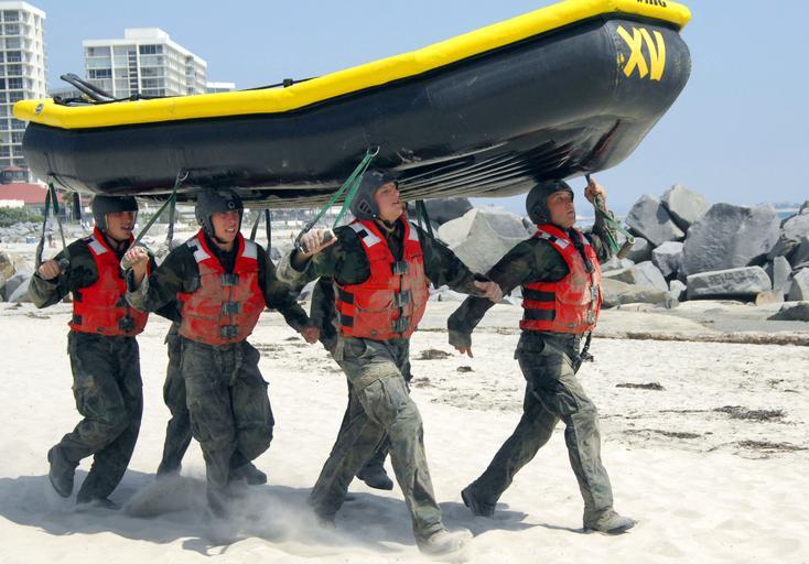 Keywords: US Navy 090527-N-4301H-006 First-phase Basic Underwater Demolition-SEAL (BUD-s) candidates balance a small inflatable boat on their heads while heading toward the Pacific Ocean.jpg en Coronado Calif May 27 2009 First-phase Basic Underwater Demolition/SEAL BUD/s candidates balance a small inflatable boat on their heads while heading toward the Pacific Ocean First phase is an eight-week course that trains prepares and examines candidatesí abilities in physical conditioning; water competency; mental tenacity and team work U S Navy photo by Mass Communication Specialist 2nd Class Shauntae Hinkle-Lymas/Released 2009-05-27 090527-N-4301H-006 Navy http //www navy mil/view_image asp id 72087 U S Navy photo by Mass Communication Specialist 2nd Class Shauntae Hinkle-Lymas PD-USGov-Military-Navy Balancing or carrying objects on the head Basic Underwater Demolitions/SEAL Naval Special Warfare Center Small boats Headcarrying in the United States |