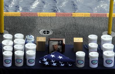 Keywords: US Navy 090609-N-3610L-073 The ashes of service members and their spouses are arranged on a table during a burial at sea ceremony aboard the aircraft carrier USS Ronald Reagan (CVN 76).jpg en PACIFIC OCEAN June 9 2009 The ashes of service members and their spouses are arranged on a table during a burial at sea ceremony aboard the aircraft carrier USS Ronald Reagan CVN 76 Capt K J Norton commanding officer of Ronald Reagan spoke to the crew and reminded them as they serve on Ronald Reagan their families are part of the Ronald Reagan family These words were held evident as a photo of Edmond McKinley Myers father of Ronald Reagan Sailor Boatswain's Mate 1st Class Ryan Myers was displayed among the ashes Ronald Reagan is on a routine deployment to the western Pacific Ocean U S Navy photo by Mass Communication Specialist 3rd Class Torrey W Lee/Released 2009-06-09 090609-N-3610L-073 Navy http //www navy mil/view_image asp id 72497 U S Navy photo by Mass Communication Specialist 3rd Class Torrey W Lee PD-USGov-Military-Navy Sea burials aboard USS Ronald Reagan CVN-76 |