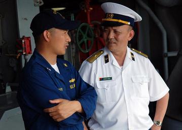Keywords: US Navy 090611-N-5207L-183 Vietnamese People's Navy Rear Adm. Do Viet Cuong, one of three observers.jpg en SINGAPORE June 11 2009 Vietnamese People's Navy Rear Adm Do Viet Cuong one of three observers from Vietnam aboard the amphibious dock landing ship USS Harpers Ferry LSD 49 for Cooperation Afloat Readiness and Training CARAT 2009 speaks with Lt Thuan Nguyen the supply officer aboard Harpers Ferry CARAT is a series of bilateral exercises held annually in Southeast Asia to strengthen relationships and enhance the operational readiness of the participating forces U S Navy photo by Mass Communication Specialist 1st Class Bill Larned/Released 2009-06-11 090611-N-5207L-183 Navy http //www navy mil/view_image asp id 72575 U S Navy photo by Mass Communication Specialist 1st Class Bill Larned PD-USGov-Military-Navy Naval ships of the United States in Singapore Aboard USS Harpers Ferry LSD-49 |