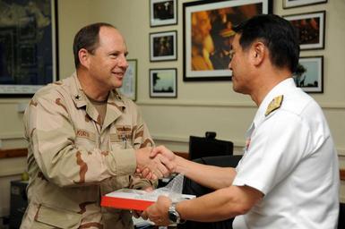 Keywords: US Navy 090615-N-2420K-021 Rear Adm. Anthony Kurta, commander, Combined Joint Task Force-Horn of Africa, shakes hands with Vice Adm. Tohru Izumi, commander-in-chief of the Japan Maritime Self-Defense Force Self-Defense Fleet.jpg en CAMP LEMONIER Djibouti June 15 2009 Rear Adm Anthony Kurta commander Combined Joint Task Force-Horn of Africa shakes hands with Vice Adm Tohru Izumi commander-in-chief of the Japan Maritime Self-Defense Force Self-Defense Fleet after exchanging gifts during an office call at Camp Lemonier Djibouti The meeting concerned coalition counter-piracy efforts in the Gulf of Aden The Japanese have deployed two P-3 aircraft to Camp Lemonier Djibouti which will patrol and provide reconnaissance on suspected pirate vessels U S Navy photo by Mass Communication Specialist 1st Class Jonathan Kulp/Released 2009-06-15 090615-N-2420K-021 Navy http //www navy mil/view_image asp id 72741 U S Navy photo by Mass Communication Specialist 1st Class Jonathan Kulp PD-USGov-Military-Navy Camp Lemonnier Anthony M Kurta |