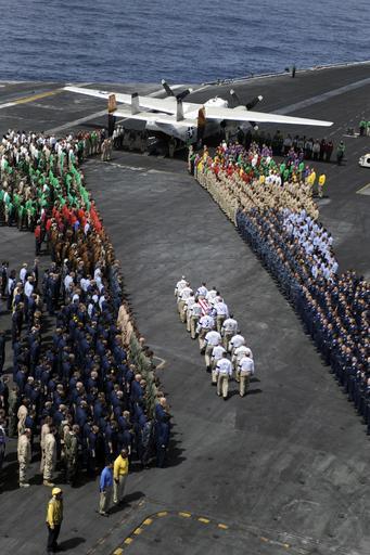 | Keywords: US Navy 090622-N-0000X-001 Chief petty officers assigned to Carrier Air Wing (CVW) 7 carry the casket of Command Master Chief Jeffrey J. Garber.jpg en ARABIAN SEA June 22 2009 Chief petty officers assigned to Carrier Air Wing CVW 7 carry the casket of Command Master Chief Jeffrey J Garber during a departure ceremony aboard the aircraft carrier USS Dwight D Eisenhower CVN 69 Garber CVW-7 command master chief died June 20 of apparent natural causes while deployed aboard the aircraft carrier He was 43 The Eisenhower Carrier Strike Group is deployed to the U S 5th Fleet area of responsibility supporting operations Enduring Freedom and Iraqi Freedom as well as maritime security operations U S Navy photo/Released 2009-06-22 090622-N-0000X-001 Navy http //www navy mil/view_image asp id 72960 U S Navy photo PD-USGov-Military-Navy Flight deck of USS Dwight D Eisenhower CVN-69 Dignified Transfers |