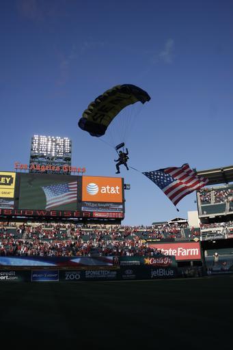 Keywords: US Navy 090702-N-5366K-231 Chief Special Warfare Operator (SEAL) William Davis, assigned to the U.S. Navy Parachute Team the Leap Frogs, flares his canopy while flying an American flag as he makes his final approach to land.jpg en ANAHEIM Calif July 2 2009 Chief Special Warfare Operator SEAL William Davis assigned to the U S Navy Parachute Team the Leap Frogs flares his canopy while flying an American flag as he makes his final approach to land during the opening ceremony of an Anaheim Angels baseball game at Angel Stadium More than 40 000 people attended the event and were able to meet the Team after the performance The Leap Frogs are based in San Diego and perform at various locations across the country to showcase Navy excellence and raise awareness about Naval Special Warfare U S Navy photo by Mass Communication Specialist 2nd Class Michelle Kapica/Released 2009-07-02 090702-N-5366K-231 Navy http //www navy mil/view_image asp id 73453 U S Navy photo by Mass Communication Specialist 2nd Class Michelle Kapica PD-USGov-Military-Navy Angel Stadium of Anaheim 2009 Los Angeles Angels of Anaheim season United States Navy Parachute Team |