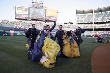 Keywords: US Navy 090702-N-5366K-249 pecial Warfare Operator 1st Class (SEAL) Robert Darakjy, assigned to the U.S. Navy Parachute Team the Leap Frogs, waves to spectators after the Team gave a parachute demonstration during the opening c.jpg en ANAHEIM Calif July 2 2009 Special Warfare Operator 1st Class SEAL Robert Darakjy assigned to the U S Navy Parachute Team the Leap Frogs waves to spectators after the Team gave a parachute demonstration during the opening ceremony of an Anaheim Angels baseball game at Angel Stadium More than 40 000 people attended the event and were able to meet the Team after the performance The Leap Frogs are based in San Diego and perform at various locations across the country to showcase Navy excellence and raise awareness about Naval Special Warfare U S Navy photo by Mass Communication Specialist 2nd Class Michelle Kapica/Released 2009-07-02 090702-N-5366K-249 Navy http //www navy mil/view_image asp id 73454 U S Navy photo by Mass Communication Specialist 2nd Class Michelle Kapica PD-USGov-Military-Navy Angel Stadium of Anaheim 2009 Los Angeles Angels of Anaheim season United States Navy Parachute Team |