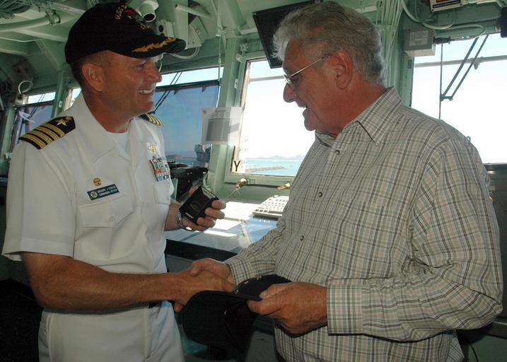 | Keywords: US Navy 090705-N-8487G-215 Capt. Gregory J. Fenton , commanding officer of the amphibious transport dock ship USS Denver (LPD 9), souvenir USS Denver ball cap and Zippo lighter.jpg en TOWNSVILLE Australia- July 5 2009 Capt Gregory J Fenton commanding officer of the amphibious transport dock ship USS Denver LPD 9 souvenir USS Denver ball cap and Zippo lighter as tokens of appreciation to Townsville Mayor Les Tyrell during a ship tour Denver is in Townsville for an eight-day port visit and will participate in Talisman Saber 2009 U S Navy photo by Mass Communication Specialist 1st Class Michael Gomez/Released 2009-07-05 090705-N-8487G-215 Navy http //www navy mil/view_image asp id 73470 U S Navy photo by Mass Communication Specialist 1st Class Michael Gomez PD-USGov-Military-Navy Images from US Navy location Townsville Australia Gregory J Fenton Aboard USS Denver LPD-9 |