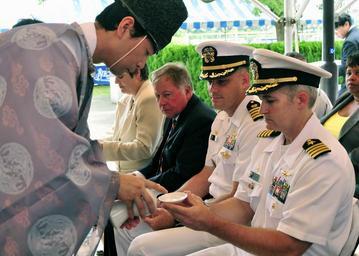 | Keywords: US Navy 090713-N-4031K-001 Commanding Officer Capt. Eric Gardner, Naval Air Facility Atsugi, Japan, accepts sake from a Shinto priest symbolizing the completion of the Navy Exchange expansion project's groundbreaking ceremony.jpg en ATSUGI Japan July 13 2009 Commanding Officer Capt Eric Gardner Naval Air Facility Atsugi Japan accepts sake from a Shinto priest symbolizing the completion of the Navy Exchange expansion project's groundbreaking ceremony The 8 8 million project will add 1 300 sq meters to the current structure and renovate the existing 1 600 sq meters The NEX will remain open during the renovation and is scheduled to be complete by the fall of 2010 U S Navy photo by Mass Communication Specialist 2nd Class Steven Khor/Released 2009-07-13 090713-N-4031K-001 Navy http //www navy mil/view_image asp id 73736 U S Navy photo by Mass Communication Specialist 2nd Class Steven Khor PD-USGov-Military-Navy Naval Air Facility Atsugi Navy Exchanges Ground-breaking ceremonies Sake |