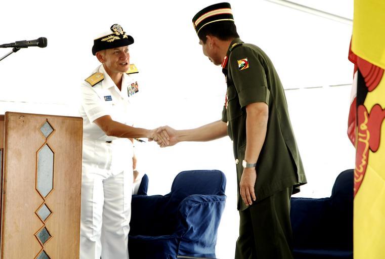| Keywords: US Navy 090810-N-2725D-119 Rear Adm. Nora Tyson, commander Logistics Group Western Pacific, extends her thanks to Col. Dato Rosli, joint forces commander, Royal Brunei Armed Forces.jpg en MUARA Brunei Aug 10 2009 Rear Adm Nora Tyson commander Logistics Group Western Pacific extends her thanks to Col Dato Rosli joint forces commander Royal Brunei Armed Forces aboard the landing ship USS Harpers Ferry LSD 49 during the closing ceremony for Cooperation Afloat Readiness and Training CARAT 2009 CARAT is a series of bilateral exercises held annually in Southeast Asia to strengthen relationships and enhance the operational readiness of the participating forces U S Navy photo by Mass Communication Specialist 2nd Class Nancy C diBenedetto/Released 2009-08-10 090810-N-2725D-119 Navy http //www navy mil/view_image asp id 75024 U S Navy photo by Mass Communication Specialist 2nd Class Nancy C diBenedetto PD-USGov-Military-Navy Images from US Navy location Muara Brunei Aboard USS Harpers Ferry LSD-49 Military of Brunei Nora Tyson Handshakes involving the military |