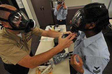 | Keywords: US Navy 090812-N-0807W-411 Hull Technician 1st Class Claude Lewis, chemical and biological Defense officer at Fleet Activities Sasebo, helps Quartermaster 2nd Class Alvera McKnight, from Covington, La., don her MCU-2P gas mask.jpg en SASEBO Japan Aug 12 2009 Hull Technician 1st Class Claude Lewis chemical and biological Defense officer at Fleet Activities Sasebo helps Quartermaster 2nd Class Alvera McKnight from Covington La don her MCU-2P gas mask during a chemical biological radiological and nuclear defense training course The course is required training for all active duty personnel in Sasebo U S Navy photo by Mass Communication Specialist 2nd Class Joshua J Wahl/Released 2009-08-12 090812-N-0807W-411 Navy http //www navy mil/view_image asp id 75086 U S Navy photo by Mass Communication Specialist 2nd Class Joshua J Wahl PD-USGov-Military-Navy MCU-2/P Protective Mask United States Fleet Activities Sasebo |