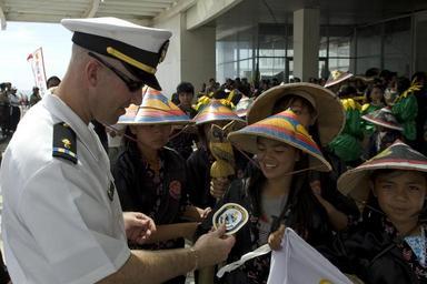 Keywords: US Navy 090818-N-9123L-032 Chief Warrant Officer Terry Boone, from Houston, Texas hands stickers to members of an Indonesian native percussion team.jpg en BITUNG Indonesia Aug 18 2009 Chief Warrant Officer Terry Boone from Houston Texas hands stickers to members of an Indonesian native percussion team before an international parade featuring Sailors assigned to the guided-missile destroyer USS McCampbell DDG 85 McCampbell is participating in the Indonesia International Fleet Review which celebrates sixty-four years of Indonesian independence U S Navy photo by Mass Communication Specialist 2nd Class Byron C Linder/Released 2009-08-18 090818-N-9123L-032 Navy http //www navy mil/view_image asp id 75281 U S Navy photo by Mass Communication Specialist 2nd Class Byron C Linder PD-USGov-Military-Navy Images from US Navy location Bitung Indonesia Aboard USS McCampbell DDG-85 |