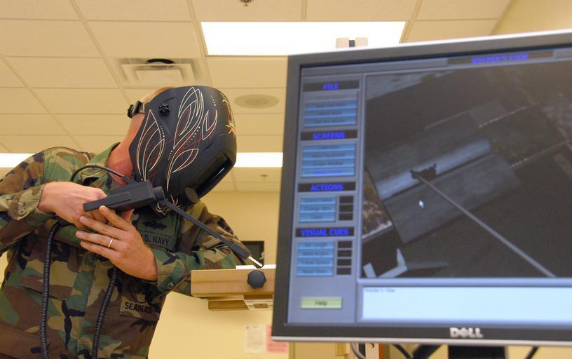 | Keywords: US Navy 090824-N-6272M-001 Steel Worker 1st Class Josh Eichelberger demonstrates the virtual welder system at Naval Construction Battalion Center.jpg en GULFPORT Miss Aug 24 2009 Steel Worker 1st Class Josh Eichelberger steel worker leading petty officer at Naval Construction Training Center NCTC demonstrates the virtual welder system at Naval Construction Battalion Center NCTC saves thousands of dollars worth of supplies by allowing students to practice on the virtual welder before attempting an actual weld U S Navy photo by Rob Mims/Released 2009-08-24 090824-N-6272M-001 Navy http //www navy mil/view_image asp id 75598 U S Navy photo by Rob Mims PD-USGov-Military-Navy Naval Construction Battalion Center Gulfport Welding Simulation |