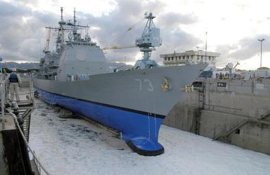 Keywords: US Navy 090924-N-0676F-001 Docking Officer Lt. Cmdr. Michael Smith, far left, oversees the undocking of USS Port Royal (CG 73) from Dry Dock 4 at Pearl Harbor Naval Shipyard.jpg en PEARL HARBOR Hawaii Sept 24 2009 Docking Officer Lt Cmdr Michael Smith far left oversees the undocking of USS Port Royal CG 73 from Dry Dock 4 at Pearl Harbor Naval Shipyard Port Royal was in dry dock for about seven months to repair damage sustained when the ship ran aground in February 2009 The red-and-white checkered hardhat signifies Smith as the docking officer U S Navy photo by Marshall Fukuki/Released 2009-09-24 090924-N-0676F-001 Navy http //www navy mil/view_image asp id 76856 U S Navy photo by Marshall Fukuki PD-USGov-Military-Navy Pearl Harbor dry docks General views of USS Port Royal CG-73 |