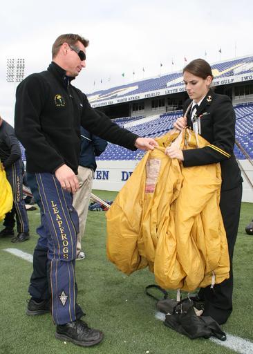 | Keywords: US Navy 091030-N-5366K-021 Chief Special Warfare Boat Operator (SWCC) J.C. Ledbetter, assigned to the U.S. Navy Parachute Team, the Leap Frogs, shows a midshipman from the U.S. Naval Academy's parachute team how to pack.jpg en ANNAPOLIS Md Oct 30 2009 Chief Special Warfare Boat Operator SWCC J C Ledbetter assigned to the U S Navy Parachute Team the Leap Frogs shows a midshipman from the U S Naval Academy's parachute team how to pack his parachute after a practice jump at the at the Navy-Marine Corps Memorial Stadium The team performed in the area to raise awareness about Naval Special Warfare The Leap Frogs are based in San Diego and perform freefall parachuting demonstrations across the United States U S Navy photo by Mass Communication Specialist 2nd Class Michelle Kapica/Released 2009-10-30 091030-N-5366K-021 Navy http //www navy mil/view_image asp id 77987 U S Navy photo by Mass Communication Specialist 2nd Class Michelle Kapica PD-USGov-Military-Navy United States Naval Academy Navy-Marine Corps Memorial Stadium United States Navy Parachute Team |