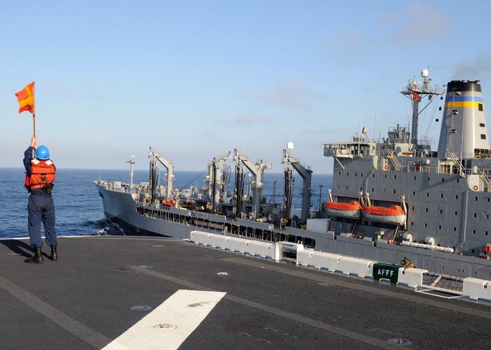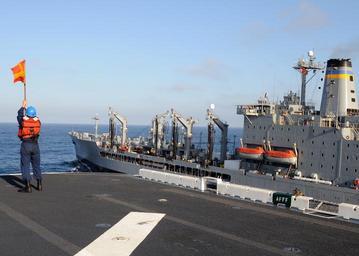 Keywords: US Navy 091119-N-3729D-019 A Sailor aboard USS Peleliu (LHA 5) waves the Romeo flag.jpg en PACIFIC OCEAN Nov 19 2009 A Sailor from deck department aboard the amphibious assault ship USS Peleliu LHA 5 waves the Romeo flag to signal to the Military Sealift Command fleet replenishment oiler USNS Guadalupe T-AO 200 Peleliu is approaching alongside to take on fuel during an underway replenishment Peleliu is underway off the coast of San Diego conducting engineering certifications U S Navy photo by Mass Communication Specialist 3rd Class Andrew J Dunlap/Released 2009-11-19 091119-N-3729D-019 Navy http //www navy mil/view_image asp id 78765 U S Navy photo by Mass Communication Specialist 3rd Class Andrew J Dunlap PD-USGov-Military-Navy Aboard USS Peleliu LHA-5 USNS Guadalupe T-AO-200 International Code of Signals