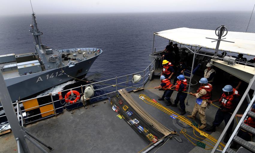 Keywords: US Navy 100324-N-7948C-286 Sailors assigned the Whidbey Island-class amphibious dock-landing ship USS Gunston Hall (LSD 44) heave on a phone-and-distance line.jpg en GULF OF GUINEA March 24 2010 Sailors assigned the Whidbey Island-class amphibious dock-landing ship USS Gunston Hall LSD 44 heave on a phone-and-distance line during an underway replenishment with the German navy Type 702 Berlin-class combat support ship Frankfurt Am Main A 1427 is pulled in during an underway replenishment Gunston Hall is deployed as part of Africa Partnership Station West an international initiative developed by Naval Forces Europe and Naval Forces Africa to improve maritime safety and security on the African continent U S Navy photo by Mass Communication Specialist 1st Class Martine Cuaron/Released 2010-03-24 100324-N-7948C-286 Navy http //www navy mil/view_image asp id 83636 U S Navy photo by Mass Communication Specialist 1st Class Martine Cuaron PD-USGov-Military-Navy Aboard USS Gunston Hall LSD-44 A1412 Frankfurt am Main ship 2002 Africa Partnership Station 2010 Bundeswehr in 2010 |