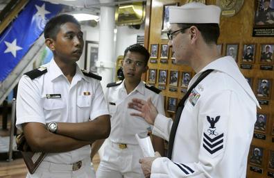 Keywords: US Navy 100405-N-7280V-079 Mass Communication Specialist 1st Class Todd Macdonald gives Sailors from the Royal Malaysian navy a tour of the ship.jpg en KOTA KINABALU Malaysia April 5 2010 Mass Communication Specialist 1st Class Todd Macdonald assigned to the U S 7th Fleet command ship USS Blue Ridge LCC 19 gives Sailors from the Royal Malaysian navy a tour of the ship Blue Ridge is on a scheduled spring deployment U S Navy photo by Mass Communication Specialist 3rd Class Daniel Viramontes/Released 2010-04-05 100405-N-7280V-079 Navy http //www navy mil/view_image asp id 84013 U S Navy photo by Mass Communication Specialist 3rd Class Daniel Viramontes PD-USGov-Military-Navy Aboard USS Blue Ridge LCC-19 Mass Communication Specialist |