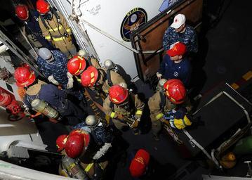 | Keywords: US Navy 100417-N-7948R-201 Sailors man a fire hose during a general quarters drill aboard the amphibious assault ship USS Peleliu (LHA 5).jpg en PACIFIC OCEAN April 17 2010 Sailors man a fire hose during a general quarters drill aboard the amphibious assault ship USS Peleliu LHA 5 Peleliu is conducting its certification exercise off the coast of Southern California in preparation for a deployment U S Navy photo by Mass Communication Specialist 2nd Class Michael Russell/Released 2010-04-17 100417-N-7948R-201 Navy http //www navy mil/view_image asp id 84479 U S Navy photo by Mass Communication Specialist 2nd Class Michael Russell PD-USGov-Military-Navy Aboard USS Peleliu LHA-5 |