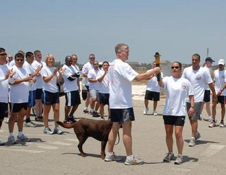 Keywords: US Navy 100610-N-6865V-002 Capt. James McHugh, commanding officer of Naval Base Ventura County accepts the Flame of Hope torch from members of the Port Hueneme Law Enforcement relay group.jpg en POINT MUGU Calif June 10 2010 Capt James McHugh commanding officer of Naval Base Ventura County accepts the Flame of Hope torch from members of the Port Hueneme Law Enforcement relay group at Naval Base Ventura County Point Mugu The Flame of Hope torch is part of the Special Olympics opening ceremony McHugh and 20 civilian and military personnel from the base carried the torch three miles U S Navy photo by Vance Vasquez/Released 2010-06-10 100610-N-6865V-002 Navy http //www navy mil/view_image asp id 86967 U S Navy photo PD-USGov-Military-Navy Naval Air Station Point Mugu |
