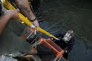 View Original:US_Navy_100616-N-4776G-503_Navy_Diver_1st_Class_Justin_Cavitt_ascends_from_the_water_after_working_under_USS_The_Sullivans_(DDG_68)_to_change_damaged_controllable_pitch_propeller_blades.jpg (4256x2832)