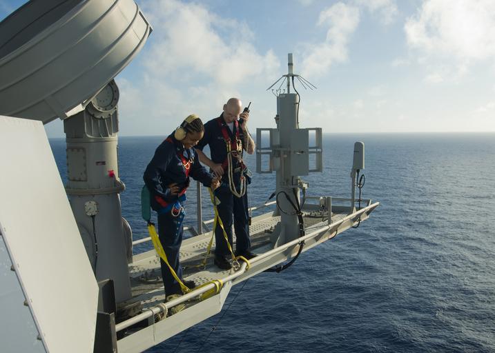 | Keywords: US Navy 100626-N-4830B-077 Sailors ommunicate with a safety observer as they perform maintenance on the OE-82 antenna on the yardarm aboard the aircraft carrier USS George Washington (CVN 73).jpg  en PACIFIC OCEAN June 26 2010 Electronics Technician 3rd Class Antonia Williams from Lagrange Ga and Electronics Technician 2nd Class Michael Milan from Seattle communicate with a safety observer as they perform maintenance on the OE-82 antenna on the yardarm aboard the aircraft carrier USS George Washington CVN 73 The radar systems are located at the top of the ship's mast 218 feet above the waterline and can only be reached by climbing aloft George Washington the Navy's only permanently forward-deployed aircraft carrier is underway supporting security and stability in the western Pacific Ocean U S Navy photo by Mass Communication Specialist 3rd Class Danielle A Brandt/Released 2010-06-26 100626-N-4830B-077 Navy http //www navy mil/view_image asp id 87745 U S Navy photo by Mass Communication Specialist 3rd Class Danielle A Brandt PD-USGov-Military-Navy Aboard USS George Washington CVN-73 |