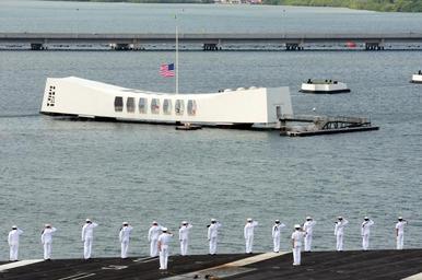 | Keywords: US Navy 100628-N-3659B-124 Sailors aboard the aircraft carrier USS Ronald Reagan (CVN 76) render honors as the ship passes by the battleship USS Arizona Memorial.jpg en PEARL HARBOR June 28 2010 Sailors aboard the aircraft carrier USS Ronald Reagan CVN 76 render honors as the ship passes by the battleship USS Arizona Memorial Ronald Reagan is in Hawaii to participate in the 22nd Rim of the Pacific RIMPAC exercise the world's largest multinational maritime exercise RIMPAC is a biennial multinational exercise designed to strengthen regional partnerships and improve multinational interoperability U S Navy photo by Mass Communication Specialist 2nd Class Joseph M Buliavac/Released 2010-06-28 100628-N-3659B-124 Navy http //www navy mil/view_image asp id 87777 U S Navy photo by Mass Communication Specialist 2nd Class Joseph M Buliavac PD-USGov-Military-Navy Manning the rail on USS Ronald Reagan CVN-76 Salutes USS Arizona Memorial |