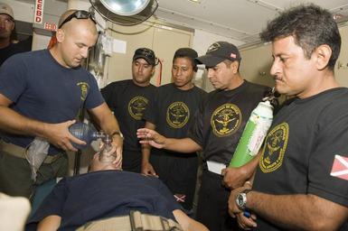 Keywords: US Navy 100705-N-1134L-020 Navy Diver 2nd Class Jason Hatch assigned to Company 2-6 of Mobile Diving and Salvage Unit (MDSU) 2, demonstrates the correct way to administer oxygen during a joint training mission with Mexican navy.jpg en VERACRUZ Mexico July 5 2010 Navy Diver 2nd Class Jason Hatch assigned to Company 2-6 of Mobile Diving and Salvage Unit MDSU 2 demonstrates the correct way to administer oxygen during a joint training mission with Mexican navy divers aboard the Military Sealift Command rescue and salvage ship USNS Grasp T-ARS 51 MDSU-2 is participating in navy diver exercises as part of Southern Partnership Station a multinational partnership engagement designed to increase interoperability and partner nation capacity through diving operations U S Navy photo by Mass Communication Specialist 2nd Class Chris Lussier/Released 2010-07-05 100705-N-1134L-020 Navy http //www navy mil/view_image asp id 88140 U S Navy photo by Mass Communication Specialist 2nd Class Chris Lussier PD-USGov-Military-Navy Aboard USNS Grasp T-ARS-51 United States Navy Divers |