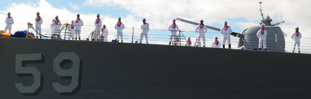 Keywords: US Navy 100806-N-3666S-020 Sailors man the rails aboard the guided-missile destroyer USS Russell (DDG 59) as the ship returns to Joint Base Pearl Harbor-Hickam.jpg en PEARL HARBOR Aug 6 2010 Sailors man the rails aboard the guided-missile destroyer USS Russell DDG 59 as the ship returns to Joint Base Pearl Harbor-Hickam after a scheduled seven-month deployment in the U S 5th and 7th Fleet areas of responsibility While on deployment Russell conducted operations in conjunction with coalition partners deployed to the Middle East and with the Dwight D Eisenhower Carrier Strike Group U S Navy photo by Mass Communication Specialist 2nd Class Robert Stirrup/Released 2010-08-06 100806-N-3666S-020 Navy http //www navy mil/view_image asp id 90100 U S Navy photo by Mass Communication Specialist 2nd Class Robert Stirrup PD-USGov-Military-Navy Aboard USS Russell DDG-59 Manning the rail in the United States Navy |