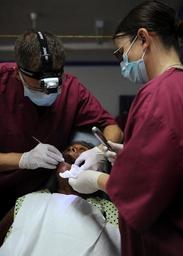 | Keywords: US Navy 100811-N-4153W-270 Capt. Davin Schmidt and Cpl. Angela Smid extract teeth from a Colombian woman at Escuela Ismael Contreras, in Covena, Colombia.jpg  en COVENAS Colombia Aug 11 2010 Capt Davin Schmidt and Cpl Angela Smid assigned to the Canadian Army deployed aboard the multi-purpose amphibious assault ship USS Iwo Jima LHD 7 extract teeth from a Colombian woman at Escuela Ismael Contreras in Covena Colombia Iwo Jima is operating off the coast of Colombia supporting Continuing Promise 2010 a humanitarian and civic assistance mission The assigned medical and engineering staff embarked aboard Iwo Jima are working with partner nation's teams to provide medical dental veterinary and engineering assistance to eight different nations U S Navy photo by Mass Communication Specialist 2nd Class Bryan Weyers/Released 2010-08-11 100811-N-4153W-270 Navy http //www navy mil/view_image asp id 90205 U S Navy photo by Mass Communication Specialist 2nd Class Bryan Weyers PD-USGov-Military-Navy Aboard USS Iwo Jima LHD-7 |