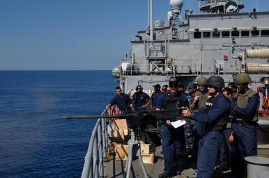 Keywords: US Navy 100830-N-7293M-022 Gunnerâ^euro,^trade,s Mate 2nd Class Joshua Leech demonstrates the operation of a .50-caliber machine gun during weapons training aboard SS Ponce (LPD 15).jpg en ATLANTIC OCEAN Aug 30 2010 Gunnerâ s Mate 2nd Class Joshua Leech demonstrates the operation of a 50-caliber machine gun during weapons training on the foc'sle of the amphibious transport dock USS Ponce LPD 15 as the ship transits the Atlantic Ocean after deploying from Norfolk Va Aug 27 Ponce is part of the Kearsarge Amphibious Readiness Group KSG ARG supplying food water and heavy-lift equipment in support of the humanitarian relief efforts for flood victims in Pakistan U S Navy photo by Mass Communication Specialist 1st Class Nathanael Miller/Released 2010-08-30 100830-N-7293M-022 Navy http //www navy mil/view_image asp id 91062 U S Navy photo by Mass Communication Specialist 1st Class Nathanael Miller PD-USGov-Military-Navy Aboard USS Ponce LPD-15 |