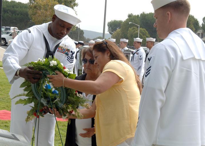 | Keywords: US Navy 100917-N-3931M-174 Family members place a wreath on the Prisoner of War and Missing in Action Memorial at Naval Hospital Camp Pendleton.jpg en CAMP PENDLETON Calif Sept 17 2010 Esmeralda Denton center left wife of Hospital Corpsman 3rd Class Manuel Reyes Denton and their daughter Barbara Denton-Brownell place a wreath on the Prisoner of War and Missing in Action Memorial at Naval Hospital Camp Pendleton during a service of remembrance on National POW/MIA Recognition Day Assisting Denton are Petty Officers 1st Class Walter Hooks left and Alex Isenhour U S Navy photo by Mass Communication Specialist 1st Class Michael R McCormick/Released 2010-09-17 100917-N-3931M-174 Navy http //www navy mil/view_image asp id 92142 U S Navy photo by Mass Communication Specialist 1st Class Michael R McCormick PD-USGov-Military-Navy Marine Corps Base Camp Pendleton National POW/MIA Recognition Day Memorial wreaths |