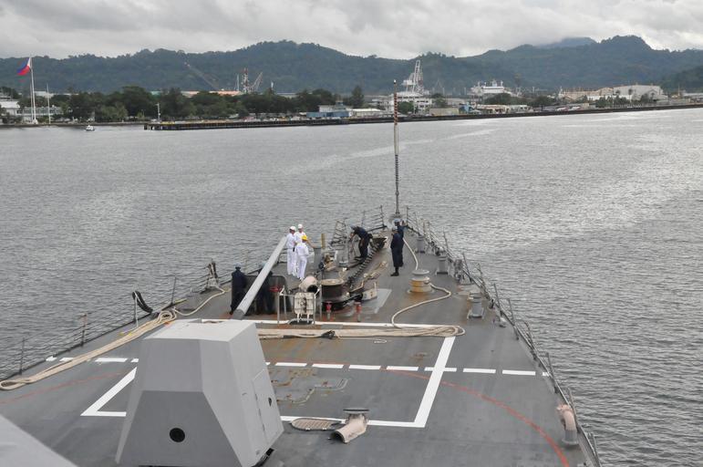 Keywords: US Navy 101002-N-0966O-001 Sailors prepare for mooring on the foc'sle of the Arleigh Burke-class guided-missile destroyer USS Lassen (DDG 82).jpg en SUBIC BAY Philippines Oct 2 2010 Sailors prepare for mooring on the foc'sle of the Arleigh Burke-class guided-missile destroyer USS Lassen DDG 82 as the ship approaches the pier in Subic Bay Philippines Lassen is assigned to Destroyer Squadron DESRON 15 and is forward-deployed to Yokosuka Japan U S Navy photo by Gas Turbine Systems Electrical 3rd Class Charlotte C Oliver/Released 2010-10-02 101002-N-0966O-001 Navy http //www navy mil/view_image asp id 92350 U S Navy photo PD-USGov-Military-Navy Aboard USS Lassen DDG-82 |