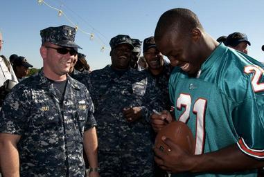 Keywords: US Navy 101109-N-7948C-094 Miami Dolphin cornerback Vontae Davis signs a football for Chief Warrant Officer 2nd Mike Puit during a tour of the guid.jpg en FT LAUDERDALE Fla Nov 9 2010 Miami Dolphin cornerback Vontae Davis signs a football for Chief Warrant Officer 2nd Mike Puit during a tour of the guided-missile destroyer Pre-Commissioning Unit PCU Jason Dunham DDG 109 The Arleigh Burke-class ship is in port to prepare for a commissioning ceremony Nov 13 The ship is named after U S Marine Cpl Jason Dunham who was mortally wounded by insurgents in Iraq in April 2004 and was posthumously awarded the Medal of Honor Jan 11 2007 U S Navy photo by Mass Communication Specialist 1st Class Martin Cuaron/Released 2010-11-09 101109-N-7948C-094 Navy http //www navy mil/view_image asp id 93999 U S Navy photo by Mass Communication Specialist 1st Class Martin Cuaron PD-USGov-Military-Navy Images from US Navy location Fort Lauderdale Fla USS Jason Dunham DDG-109 Vontae Davis American football players giving autographs |