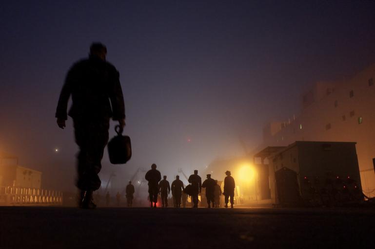| Keywords: US Navy 101118-N-9643K-771 Sailors assigned to the amphibious assault ship USS Bonhomme Richard (LHD 6) walk through early morning fog to the ship.jpg en SAN DIEGO Nov 18 2010 Sailors assigned to the amphibious assault ship USS Bonhomme Richard LHD 6 walk through early morning fog to the ship and the messing and berthing barge Bonhomme Richard is preparing for a dry-dock maintenance availability period starting in December U S Navy photo by Chief Mass Communication Specialist Joe Kane/Released 2010-11-18 101118-N-9643K-771 Navy http //www navy mil/view_image asp id 94328 U S Navy photo by Chief Mass Communication Specialist Joe Kane PD-USGov-Military-Navy Aboard USS Bonhomme Richard LHD-6 Photographs by Joseph Kane |