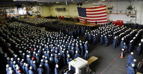 | Keywords: US Navy 101203-N-2475A-015 Sailors stand at attention in the hangar bay during a frocking ceremony aboard USS John C. Stennis (CVN 74).jpg en BREMERTON Wash Dec 3 2010 Sailors stand at attention in the hangar bay during a frocking ceremony aboard the Nimitz-class aircraft carrier USS John C Stennis CVN 74 John C Stennis is moored at Puget Sound Naval Shipyard undergoing a maintenance availability U S Navy photo by Mass Communication Specialist 3rd Class Kenneth Abbate/Released 2010-12-03 101203-N-2475A-015 Navy http //www navy mil/view_image asp id 94913 U S Navy photo by Mass Communication Specialist 3rd Class Kenneth Abbate PD-USGov-Military-Navy Aboard USS John C Stennis CVN-74 |