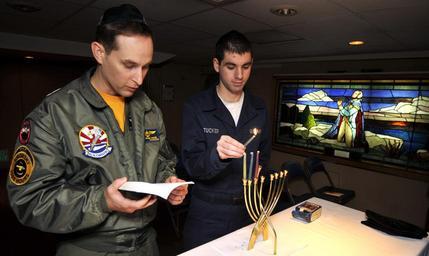 | Keywords: US Navy 101203-N-7103C-028 Yeoman Seaman Kevin Tucker, from Quaker Town, Penn., lights the Menorah during the third day of Hanukkah while Lt. Cmdr.jpg  en WATERS WEST OF KOREAN PENINSULA Dec 3 2010 Yeoman Seaman Kevin Tucker from Quaker Town Penn lights the Menorah during the third day of Hanukkah while Lt Cmdr Ryan Hayes from San Diego reads a Jewish scripture in the chapel aboard the aircraft carrier USS George Washington CVN 73 U S Navy photo by Mass Communication Specialist 3rd Class David A Cox/Released 2010-12-03 101203-N-7103C-028 Navy http //www navy mil/view_image asp id 94897 U S Navy photo by Mass Communication Specialist 3rd Class David A Cox PD-USGov-Military-Navy USS George Washington CVN-73 chapel People lighting a Hanukiah Hanukkah in the military of the United States |