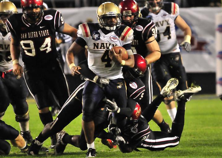 | Keywords: US Navy 101223-N-1722W-182 U.S. Naval Academy quarterback Ricky Dobbs (^4), tries to get past San Diego State University defenders during the 2010.jpg en SAN DIEGO Dec 23 2010 U S Naval Academy quarterback Ricky Dobbs 4 tries to get past San Diego State University defenders during the 2010 Poinsettia Bowl Navy lost to San Diego 14-35 U S Navy photo by Mass Communication Specialist 3rd Class Trevor Welsh/Released 2010-12-23 101223-N-1722W-182 Navy http //www navy mil/view_image asp id 95771 U S Navy photo by Mass Communication Specialist 3rd Class Trevor Welsh PD-USGov-Military-Navy 2010 Poinsettia Bowl |