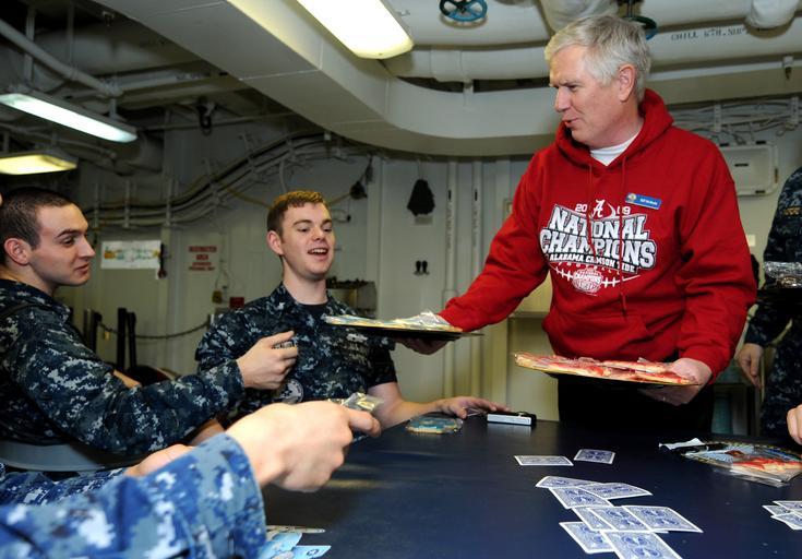 Keywords: US Navy 110206-N-6632S-624 U.S. Rep. Mo Brooks (R-Ala.) passes out cookies donated by various schools to Sailors aboard the aircraft carrier USS Ge.jpg en ATLANTIC OCEAN Feb 6 2011 U S Rep Mo Brooks R-Ala passes out cookies donated by various schools to Sailors aboard the aircraft carrier USS George H W Bush CVN 77 George H W Bush is underway in the Atlantic Ocean conducting a composite training unit exercise U S Navy photo by Mass Communication Specialist 3rd Class Kevin J Steinberg/Released 2011-02-06 110206-N-6632S-624 Navy http //www navy mil/view_image asp id 97337 U S Navy photo by Mass Communication Specialist 3rd Class Kevin J Steinberg PD-USGov-Military-Navy Aboard USS George H W Bush CVN-77 Mo Brooks |
