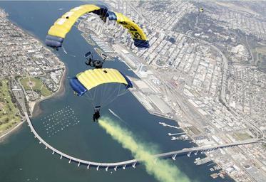 | Keywords: US Navy 110316-N-0000W-116 Members of the U.S. Navy parachute demonstration team, the Leap Frogs, perform a T-formation during a training jump abov.jpg en CORONADO Calif March 16 2011 Members of the U S Navy parachute demonstration team the Leap Frogs perform a T-formation during a training jump above Naval Amphibious Base Coronado The team is stationed in Coronado and performs demonstrations across the country in support of Naval Special Warfare and Navy recruiting U S Navy photo by James Woods/Released 2011-03-16 110316-N-0000W-116 Navy http //www navy mil/view_image asp id 98629 U S Navy photo by James Woods PD-USGov-Military-Navy Naval Amphibious Base Coronado United States Navy Parachute Team Aerial photographs of San Diego Aerial views of San Diego-Coronado Bridge Aerial photographs of Coronado California |
