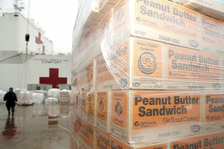 | Keywords: US Navy 110331-N-NY820-087 Girl Scout cookies donated through the Troop to Troop program by the Girl Scouts of Citrus council in Central Florida ar.jpg en NORFOLK March 31 2011 Girl Scout cookies donated through the Troop to Troop program by the Girl Scouts of Citrus council in Central Florida are loaded onto the Military Sealift Command hospital ship USNS Comfort T-AH 20 Six-thousand boxes of cookies were donated Comfort is in Norfolk for final outfitting and personnel embarkation in preparation for Continuing Promise 2011 CP11 a five-month humanitarian assistance mission to nine countries in the Caribbean Central America and South America U S Navy photo by Mass Communication Specialist 2nd Class Eric Tretter/Released 2011-03-31 110331-N-NY820-087 Navy http //www navy mil/view_image asp id 99372 U S Navy photo by Mass Communication Specialist 2nd Class Eric Tretter PD-USGov-Military-Navy Aboard USNS Comfort T-AH-20 Girl Scout cookies Scouting in Virginia |